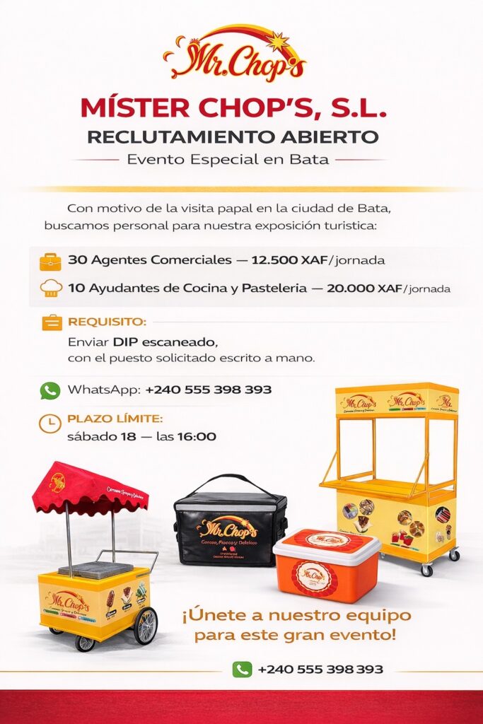 En un contexto marcado por la expectativa que genera la visita papal a la ciudad de Bata, la empresa Mister Chop’s, especializada en la producción y comercialización de helados, yogures y productos de restauración, ha puesto en marcha un proceso de contratación temporal para atender la demanda prevista.